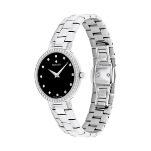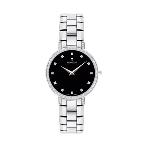 Movado Faceto, 28mm stainless steel case and bracelet with diamond set lugs. Features a black dial with 12 diamond markers & diamond set bezel. Swiss quartz movement, scratch resistance sapphire crystal. Water resistance upto 30 meters.