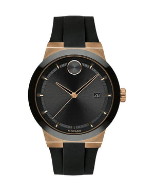 Bronze ion-plated stainless steel case with a black silicone strap. Fixed black bezel. Black dial with luminous bronze hands and index hour markers. Minute markers. The Movado dot appears at the 12 o'clock position. Dial Type: Analog. Date display at the 3 o'clock position. Quartz movement. Scratch resistant K1 mineral crystal. Pull / push crown. Solid case back. Round case shape. Case size: 42 mm. Case thickness: 9.9 mm. Band width: 21 mm. Tang clasp. Water resistant at 30 meters / 100 feet. Functions: date, hour, minute, second. Bold Series. Casual watch style. Watch label: Swiss Made. Movado Bold Quartz Black Dial Black Silicone Men's Watch 3600622.
