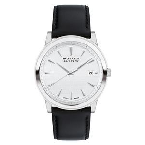 Movado Heritage Series Disco Volante Automatic, 40 mm stainless steel case with silver white stamped dial on a black leather strap. Caseback features an exposed automatic movement. Water resistance upto 50 meters.