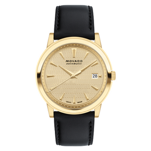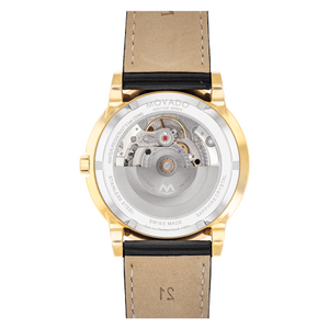 Movado Heritage Series Disco Volante Automatic, 40 mm yellow gold ion-plated stainless steel case with yellow gold stamped dial on a black leather strap. Caseback features an exposed automatic movement. Water resistance upto 50 meters.