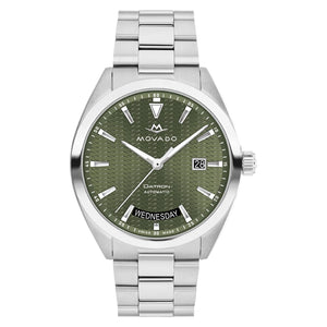 Retro-cool design, timeless styling, and a distinctive case have defined the Datron Collection for over 50 years. Inspired by our archives, this timepiece features a 40mm case of stainless steel housing a chevron textured green dial fitted with a day window, a date window, and Swiss Super-LumiNova® accents. We’ve added a modern touch with an exquisite Swiss made automatic movement. A fluid H-link bracelet in matching stainless steel and an effortless push-button deployment clasp complete this essential piece. Automatic watches do not contain batteries. They are charged by the movement of your wrist. If the watch is not worn it will stop running in about 38 hours. To get it started, turn the crown clockwise about 20-30 times until the second-hand starts moving. You will most likely need to reset the time and date.