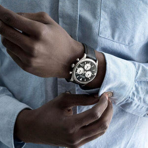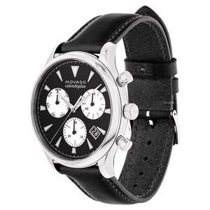 Stainless steel case with a black leather strap. Fixed stainless steel bezel. Black dial with silver-tone hands and index hour markers. Minute markers around the outer rim. Dial Type: Analog. Luminescent hands and markers. Date display between the 4 and 5 o'clock positions. Chronograph - two sub-dials displaying: 60 seconds and 30 minutes. day of the week. Swiss quartz movement. Scratch resistant sapphire crystal. Solid case back. Case size: 43 mm. Round case shape. Tang clasp. Water resistant at 30 meters / 100 feet. Functions: chronograph, date, day of the week, hour, minute, second. Dress watch style. Movado Heritage Chronograph Black Dial Men's Watch 3650005.