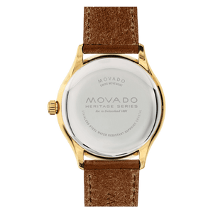 Gold-tone stainless steel case with a brown leather strap. Fixed gold-tone stainless steel bezel. Blue dial with gold-tone hands and index hour markers. Minute markers around the outer rim. Dial Type: Analog. Luminescent hands and markers. Date display at the 3 o'clock position. Quartz movement. Scratch resistant sapphire crystal. Pull / push crown. Solid case back. Round case shape. Case size: 40 mm. Buckle clasp. Water resistant at 30 meters / 100 feet. Functions: date, hour, minute, second. Casual watch style. Watch label: Swiss Movt. Movado Heritage Quartz Blue Dial Men's Watch 3650028.