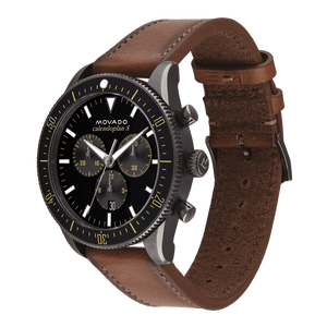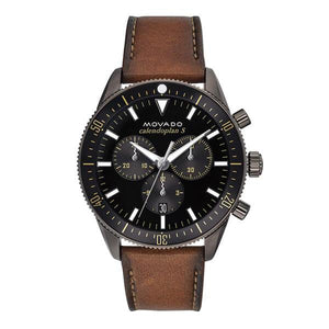 Gunmetal ion-plated stainless steel case with a cognac leather strap. Uni-directional rotating gunmetal ion-plated bezel with a black aluminum ring. Black dial with luminous silver-tone hands and index hour markers. Minute markers around the outer rim. Dial Type: Analog. Luminescent hands and markers. Date display at the 6 o'clock position. Chronograph - three sub-dials displaying: 60 second, 30 minute and 12 hours. Quartz movement. Scratch resistant sapphire crystal. Pull / push crown. Solid case back. Round case shape. Case size: 42 mm. Strap width: 20 mm. Tang clasp. Water resistant at 50 meters / 165 feet. Functions: chronograph, date, hour, minute, second. Sport watch style. Watch label: Swiss Movt. Movado Heritage Chronograph Black Dial Men's Watch 3650060.