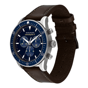 Stainless steel case with a chocolate leather strap. Uni-directional rotating stainless steel bezel with a blue aluminium ring. Navy dial with luminous silver-tone hands and index hour markers. Minute markers around the outer rim. Dial Type: Analog. Luminescent hands and markers. Date display at the 6 o'clock position. Chronograph - three sub-dials displaying: 60 second, 30 minute and 12 hour. Quartz movement. Scratch resistant sapphire crystal. Solid case back. Round case shape. Case size: 42 mm. Tang clasp. Water resistant at 50 meters / 165 feet. Functions: chronograph, date, hour, minute, second. Heritage Series. Sport watch style. Watch label: Swiss Made. Movado Heritage Navy Dial Chronograph Men's Watch 3650061.