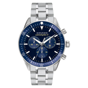 Stainless steel case with a stainless steel bracelet. Uni-directional rotating stainless steel bezel with a blue ring. Blue dial with luminous silver-tone hands and index hour markers. Minute markers around the outer rim. Dial Type: Analog. Luminescent hands and markers. Date display at the 6 o'clock position. Chronograph - three sub-dials displaying: 60 second, 30 minute and 12 hour. Quartz movement. Scratch resistant sapphire crystal. Pull / push crown. Solid case back. Round case shape. Case size: 42 mm. Band width: 22 mm. Fold over clasp with a push button release. Water resistant at 50 meters / 165 feet. Functions: chronograph, date, hour, minute, second. Heritage Series. Casual watch style. Watch label: Swiss Movt. Movado Heritage Chronograph Quartz Black Dial Men's Watch 3650101.