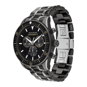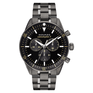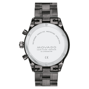 Movado Heritage Series Calendoplan Chronograph, 42mm gunmetal ion-plated stainless steel case and bracelet with black chronograph dial & unidirectional bezel. Scratch resistance sapphire crystal, swiss quartz movement. Water resistance upto 50 meters.