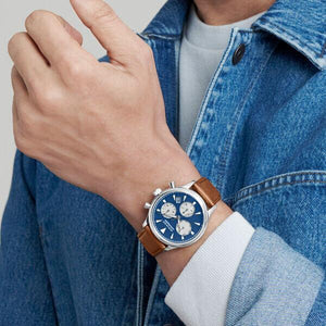 Movado Heritage Series Calendoplan Chronograph, 43 mm stainless steel case with blue chronograph dial. Features Swiss Super-LumiNova accents and date window detailing on a cognac brown leather strap. Water resistance upto 30 meters.