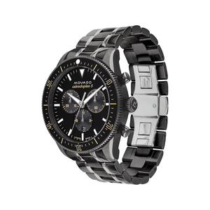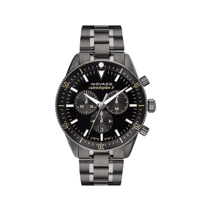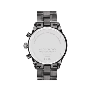 The Movado Heritage Series Calendoplan S Chronograph is as attractive as it is functional. The design has a 42mm gunmetal ion-plated stainless steel case with fluidly extended lugs, black chronograph dial and unidirectional coin-edge bezel. This watch features Swiss Super-LumiNova® accents and date window. The matching gunmetal ion-plated stainless steel bracelet secures with a push-button deployment clasp. Water resistance upto 50 meters.