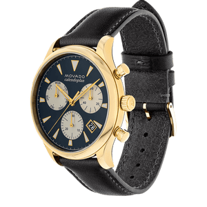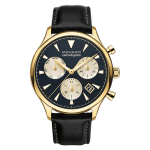 Men's Movado Heritage Series Calendoplan chronograph, 43 mm yellow gold ion-plated stainless steel case; round blue dial with luminescent gold-toned hands/applied markers, parchment-colored subdials (day/minute counter/small seconds), printed parchment minute index, date display; black leather strap with grey top-stitching and classic yellow gold ion-plated steel buckle. Scratch resistance sapphire crystal. Water resistance upto 30 meters.