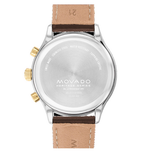 First introduced in 1950, the Movado Calendoplan captures the soul of mid-century design with contemporary details. This timeless chronograph timepiece is inspired by our archives and features a 43mm stainless steel and yellow gold ion-plated stainless steel case framing a deep blue dial outfitted with three white subdials, Swiss Super-LumiNova® accents and a date window. The design is completed with a smooth leather strap in classic chocolate brown with a yellow gold ion-plated stainless steel buckle.