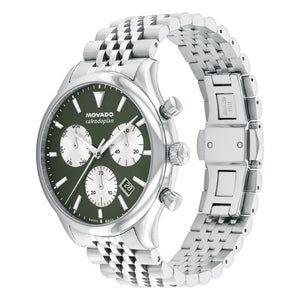 The Heritage Series Calendoplan takes a modern approach to a classic 1950's silhouette. This 43mm chronograph watch features a cypress green dial with white subdials, Swiss Super-LumiNova® accents, and a date window.