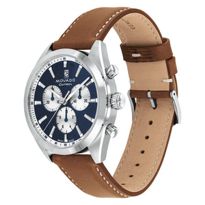 Retro-cool design, timeless styling and a distinctive case have defined the Datron Collection for over 50 years. Inspired by our archives, this chronograph features a 41mm case of stainless steel housing a navy dial fitted with three steel subdials, Swiss Super-LumiNova® accents and a date window. A luxurious cognac leather strap and matching stainless steel buckle complete this essential piece. Quartz movement. Water resistance up to 50 meters. Sapphire crystal. Pin buckle clasp.