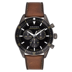 Movado heritage series calendoplan S chronograph, 42mm gunmetal ion plated case with fluidly extended lugs, black aluminum bezel and black chronograph dial. Features swiss super luminova accents on cognac leather strap. Quartz movement. Water resistance up to 50 meters. Sapphire crystal. Pin buckle clasp.
