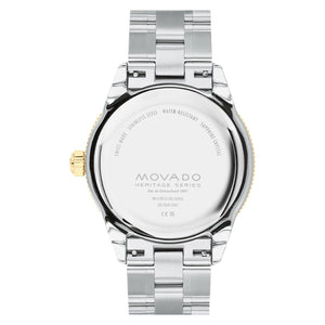 Movado heritage series calendoplan, 43 mm stainless steel and yellow gold case and bracelet with green toned dial. Quartz movement. Water resistance up to 50 meters. Deployment clasp with push button