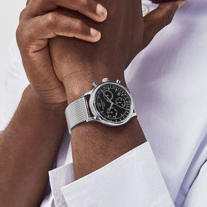 Mid century design meets sporty style. Cast in sleek stainless steel, this chronograph boasts a 43mm case and black dial featuring three sub dials, a date window, and a tachymeter scale. A fluid mesh strap completes this essential timepiece. Quartz movement. Case size 43mm. Water resistance up to 30 meters. Scratch resistant sapphire crystal. Sliding clasp.