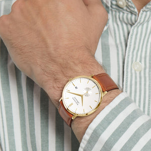 Capture vintage sophistication with this timeless watch. Inspired by our archives, this timepiece features a 40mm case with a gleaming ion-plated yellow gold finish and a luxurious congac top-stitched leather strap with a yellow gold ion-plated stainless steel buckle. Its powder white dial is outfitted with golden accents, printed black minute index, a date window, and a sub dial to mark the seconds. Quartz movement. Water resistance up to 30 meters. Sapphire crystal.