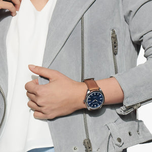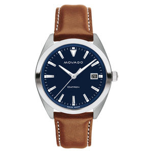 Retro cool design defined by timeless styling and a distinctive case have defined the Datron Collection for over 50 years. Inspired by our archives, this design features a 39mm case of stainless steel housing a deep blue dial fitted with swiss super luminova accents and a date window. A luxurious cognac leather strap and matching stainless steel buckle complete this essential piece. Quartz movement. Water resistance up to 30 meters. Sapphire crystal.