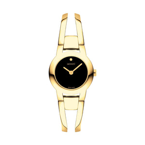 Elegant, sculpted modern design. Womens movado Impresa watch, 24 mm gold PVD case, black museum dial with gold toned dot and hands, gold PVD double bar bangle bracelet with back sizing links and jewelry clasp, sapphire crystal, swiss quartz movement. Water resistance up to 30 meters. Jewelry clasp.