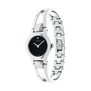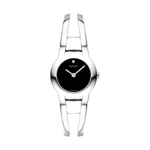 Elegant, sculpted modern design. Womens movado Impresa watch, 24 mm stainless steel case, black museum dial with silver toned dot and hands, stainless steel double bar bangle bracelet with back sizing links and jewelry clasp, sapphire crystal, swiss quartz movement. Water resistance up to 30 meters.