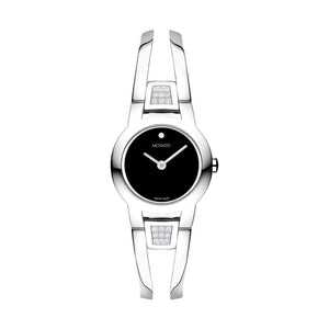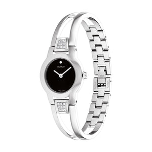 Elegant, sculpted modern design. Women's movado Impresa watch, 24 mm stainless steel case, black Museum dial with silver toned dot and hands, stainless steel diamond set double bar bangle bracelet with back sizing links and jewelry clasp, sapphire crystal, Swiss quartz movement.