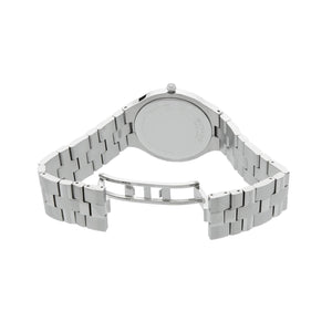 Stainless steel case with a stainless steel bracelet. Fixed stainless steel bezel. Black dial with silver-tone hands. No markers. The Movado dot appears at the 12 o'clock position. Dial Type: Analog. Quartz movement. Scratch resistant sapphire crystal. Pull / push crown. Solid case back. Round case shape. Case size: 40 mm. Band width: 20 mm. Hidden fold over clasp. Water resistant at 30 meters / 100 feet. Functions: hour, minute. Juro Series. Casual watch style. Watch label: Swiss Made. Movado Juro Quartz Black Dial Men's Watch 0607442.