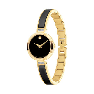 Redefining modern elegance. Iconic design meets feminine style in our new moda collection. This sophisticated bangle features a slim yellow gold PVD finished bracelet and sleek black ceramic inlay paired with a chic 24mm case framing our signature museum dial. A row of sparkling diamonds frames the case to create the ultimate in contemporary luxury. A jewelry clasp closure completes the design. Yellow PVD finished stainless steel with diamonds case, black dial. Quartz movement. Water resistance up to 30 meters. Scratch resistant sapphire crystal.