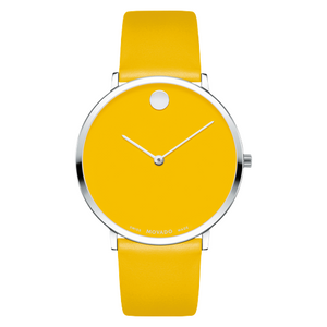Movado Museum Dial Modern 47 watch, 40 mm stainless steel case, 6.30 mm thin, with yellow dial and stainless steel original flat dot and stick hands, yellow calfskin strap with stainless steel classic tongue buckle. Water resistance upto 30 meters.