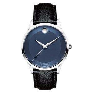 Men's Movado Collection automatic watch, 40 mm stainless steel case, 3-hand blue dial with tone-on-tone outer ring and silver-toned iconic dot and hands, textured black calfskin strap with stainless steel classic buckle. Scratch resistance sapphire crystal glass. Water resistance upto 30 meters.