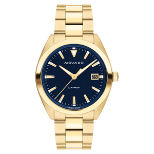 Retro-cool design defined by timeless styling and a distinctive case have defined the Datron Collection for over 50 years. Inspired by our archives, this design features a 39mm case of rich yellow gold ion-plated stainless steel housing a deep blue dial fitted with Swiss Super-LumiNova® accents and a date window. A fluid H-link bracelet in matching yellow gold ion-plated stainless steel and effortless push-button deployment clasp complete this essential piece. Water resistance up to 50 meters. Deployment clasp.