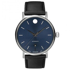 Movado Swiss Museum Classic Blue Dial Men's Watch. Stainless steel case with black leather strap. Swiss automatic movement, crystal sapphire glass. Case size 40 mm. Water resistance upto 30 meters.