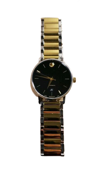 Movado Classic Museum men's Watch. Stainless steel case and two tone silver and gold plated bracelet, swiss automatic movement. Sapphire crystal glass with black museum concave dot dial. Case size 40 mm. Water resistance upto 30 meters.