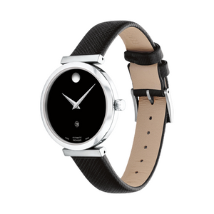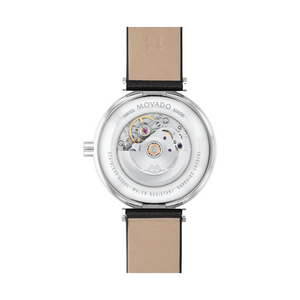 It’s time you owned a masterpiece. The Movado Museum Classic is an icon of modern design, featured in museums worldwide and renown for the elegant simplicity of the dial defined by a single dot at 12 o’clock, a design element that symbolizes the sun at high noon. We’ve elevated this iconic watch even further with an automatic movement powered by the motion of your body—the pinnacle of Swiss technical mastery and displayed in all its beauty with an exhibition caseback. In this style, we’ve paired a stainless steel 32mm case with a chic black dial—outfitted with our signature dot and slender hands—and a luxurious saffiano leather strap. Water resistance upto 30 meters.
