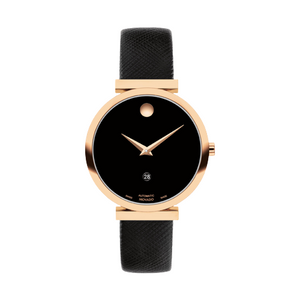 It’s time you owned a masterpiece. The Movado Museum Classic is an icon of modern design, featured in museums worldwide and renown for the elegant simplicity of the dial defined by a single dot at 12 o’clock, a design element that symbolizes the sun at high noon. We’ve elevated this iconic watch even further with an automatic movement powered by the motion of your body—the pinnacle of Swiss technical mastery and displayed in all its beauty with an exhibition caseback. In this style, we’ve paired a rich rose gold PVD 32mm case with a chic black dial—outfitted with our signature dot and slender hands—and a luxurious saffiano leather strap. Water resistance upto 30 meters.