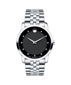 Stainless steel case with a stainless steel bracelet. Black museum dial with silver-tone hands and diamond hour markers. The Movado dot appears at the 12 o'clock position. Dial Type: Analog. Quartz movement. Scratch resistant sapphire crystal. Pull / push crown. Solid case back. Case diameter: 40 mm. Case thickness: 7.4 mm. Round case shape. Band width: 22 mm. Water resistant at 30 meters / 100 feet.