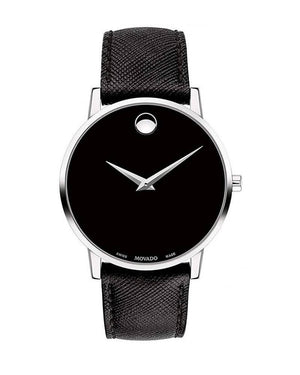 Silver-tone stainless steel case with a Black (textured) leather strap. Fixed stainless steel bezel. Black dial with silver-tone hands. No markers. The Movado dot appears at the 12 o'clock position. Dial Type: Analog. Ronda 702 quartz movement. Scratch resistant sapphire crystal. Pull / push crown. Solid case back. Round case shape. Case size: 40 mm. Case thickness: 6.3 mm. Tang clasp. Water resistant at 30 meters / 100 feet. Functions: hour, minute. Dress watch style. Watch label: Swiss Made. Movado Museum Classic Black Dial Black Leather Men's Watch 0607194.