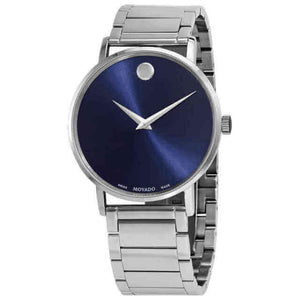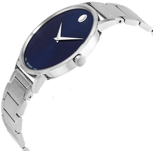 Smoke Blue dial enhanced by black / blue hands. stainless steel case with a stainless steel band. Quartz movement. Fixed bezel. Scratch Resistant K1 Mineral crystal. Solid caseback. Deployment with Push Button Release clasp. Pull / Push crown. Case size 40 mm x 7 mm. Band 20 mm x long. Movado 0607216 Classic Museum Watch. Water resistance upto 30 meters.