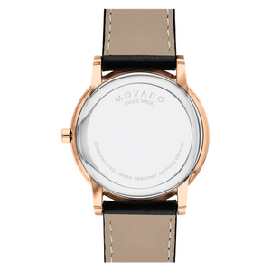 Men's Museum Classic watch, 40 mm rose gold PVD-finished stainless steel case, black Museum dial with rose gold-toned dot and hands, black calfskin strap with rose gold PVD-finished stainless steel buckle. Water resistance upto 30 meters.