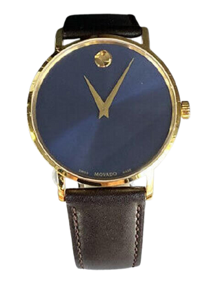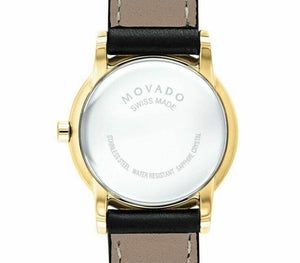 Yellow gold PVD stainless steel case with a black (calfskin) leather strap. Fixed yellow gold PVD bezel. Black museum dial with yellow gold-tone hands. No markers. The Movado dot appears at the 12 o'clock position. Dial Type: Analog. Quartz movement. Scratch resistant sapphire crystal. Pull / push crown. Solid case back. Round case shape. Case size: 40 mm. Case thickness: 7 mm. Band width: 20 mm. Tang clasp. Water resistant at 30 meters / 100 feet. Classic Museum Series. Casual watch style. Watch label: Swiss Made. Movado Classic Museum Quartz Blue Museum Dial Men's Watch 0607316.