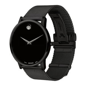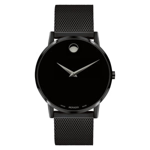 Movado museum classic, 40mm black PVD finished stainless steel case and mesh bracelet with a black toned dial. Quartz movement. Water resistance up to 30 meters. Scratch resistant sapphire crystal. Deployment clasp.