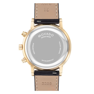 It’s time you owned a masterpiece. The Movado Museum Classic is an icon of modern design, featured in museums worldwide and renown for the elegant simplicity of the dial defined by a single dot at 12 o’clock, a design element that symbolizes the sun at high noon. In this style, we’ve paired a 42mm case in yellow goldtone PVD stainless steel with a black chronograph dial—outfitted with three subdials, our signature dot and slender hands in golden hues—and a luxurious black leather strap. Quartz movement. Water resistance up to 30 meters. Sapphire crystal. Pin buckle clasp.