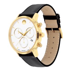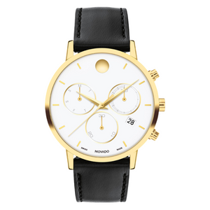 The Museum Classic is an icon of modern design featured in art institutions around the world. This 42mm chronograph watch features a white dial, tonal subdials, yellow goldtone dauphine hands, and our signature museum dial with a dot at 12 o'clock.