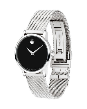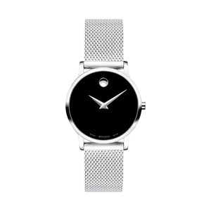Womens museum classic watch, 28 mm stainless steel case, black museum dial and silver toned dot and hands, stainless steel mesh bracelet with sliding closure clasp. Quartz movement. Water resistance up to 30 meters. Scratch resistant sapphire crystal.