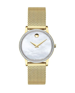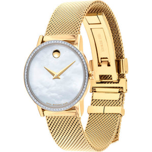 Yellow gold PVD stainless steel case with a yellow gold PVD stainless steel mesh bracelet. Fixed yellow gold PVD bezel set with 66 diamonds. Mother of pearl dial with gold-tone dauphine-style hands. No markers. The Movado dot appears at the 12 o'clock position. Dial Type: Analog. Quartz movement. Scratch resistant sapphire crystal. Pull / push crown. Solid case back. Round case shape. Case size: 28 mm. Case thickness: 6.3 mm. Band width: 15 mm. Deployment clasp with a push button release. Water resistant at 30 meters / 100 feet. Functions: hour, minute. Additional Info: case set with 66 diamonds (0.223 t.c.w). Dress watch style. Watch label: Swiss Made. Movado Museum Classic Mother of Pearl Dial Ladies Gold-tone Diamond Watch 0607307.