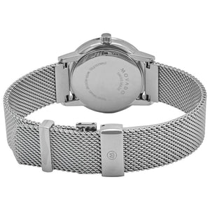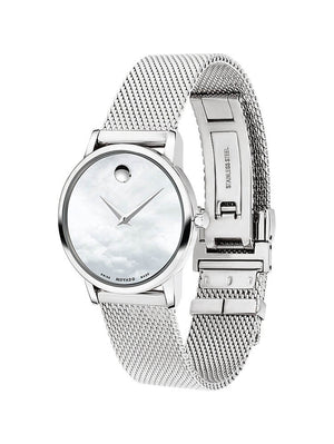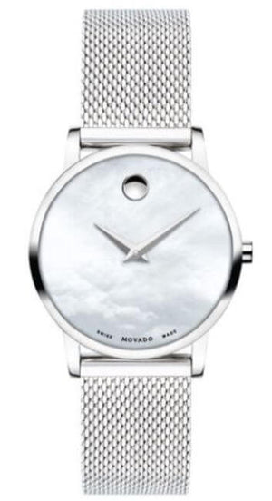 Stainless steel case with a stainless steel mesh bracelet. Fixed stainless steel bezel. Mother of pearl dial with silver-tone hands. No markers. The Movado dot appears at the 12 o'clock position. Dial Type: Analog. Quartz movement. Scratch resistant sapphire crystal. Pull / push crown. Solid case back. Round case shape. Case size: 28 mm. Band width: 15 mm, band length: 9 inches. Deployment clasp. Water resistant at 30 meters / 100 feet. Functions: hour, minute. Casual watch style. Watch label: Swiss Made. Movado Museum Classic Mother of Pearl Dial Ladies Watch 0607350.