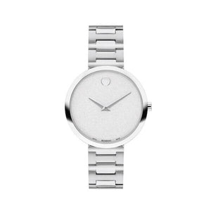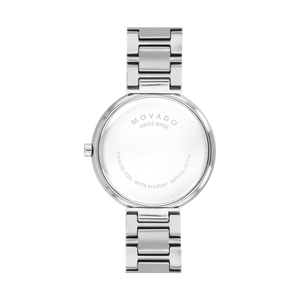 Stainless steel case with a stainless steel bracelet. Fixed stainless steel bezel. White dial with silver-tone hands. No markers. The Movado dot appears at the 12 o'clock positions. Dial Type: Analog. Quartz movement. Scratch resistant sapphire crystal. Pull / push crown. Solid case back. Round case shape. Case size: 32 mm. Band width: 13 mm. Deployment clasp. Water resistant at 30 meters / 100 feet. Functions: hour, minute. Museum Classic Series. Dress watch style. Watch label: Swiss Made. Movado Museum Classic Quartz White Dial Ladies Watch 0607518.