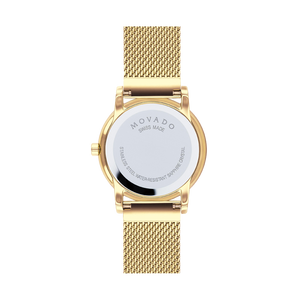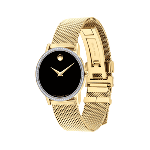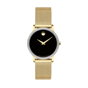 Movado Museum Classic watch, 28mm yellow gold PVD-finished stainless steel case and mesh bracelet with diamond bezel and black-toned dial with yellow gold accents. Swiss quartz movement, scratch resistance sapphire glass. Push button deployment clasp. Water resistance upto 30 meters.