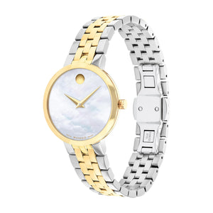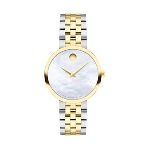 It’s time you owned a masterpiece. The Movado Museum Classic is an icon of modern design, featured in museums worldwide and renown for the elegant simplicity of the dial defined by a single dot at 12 o’clock, a design element that symbolizes the sun at high noon. In this style, we’ve paired a gleaming yellow gold PVD 30mm case with a stunning white mother-of-pearl dial and a beautiful two-tone bracelet of yellow goldtone PVD and stainless steel. The signature dot and slender hands are cast in yellow goldtone PVD for a flawless finish.
