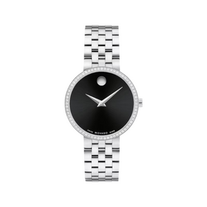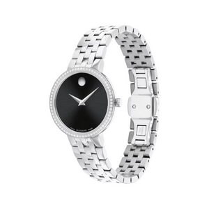 Movado museum classic quartz women's watch 0607814. Stainless steel case and bracelet with black dial. Quartz movement Water resistance up to 30 meters. Sapphire crystal. Deployment clasp with push button.