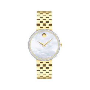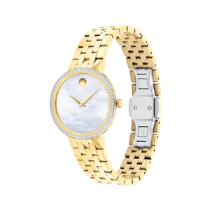 Movado museum classic quartz women's watch 0607815. Stainless steel case and bracelet with mother-of-pearl dial. Quartz movement Water resistance up to 30 meters. Sapphire crystal. Deployment clasp with push button.